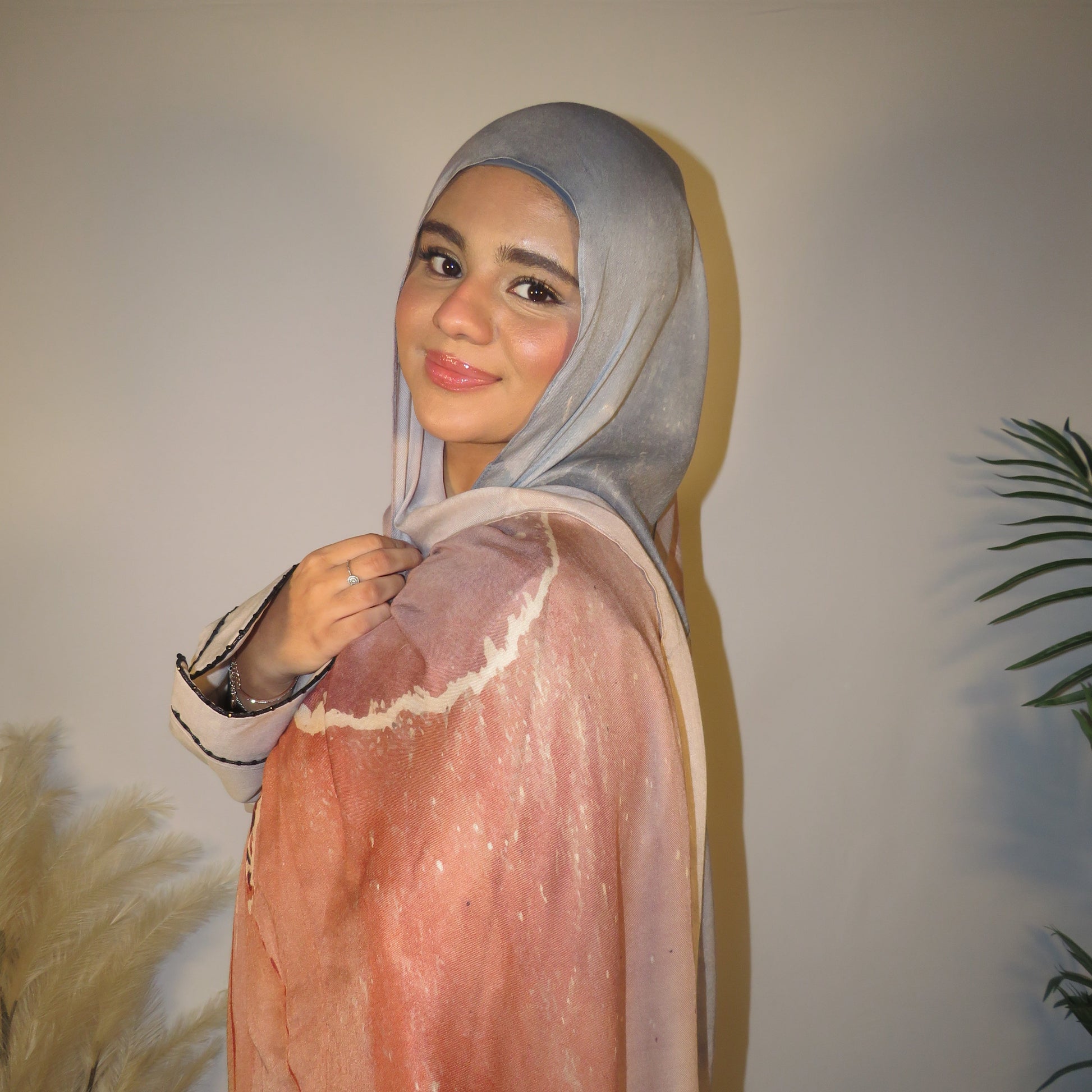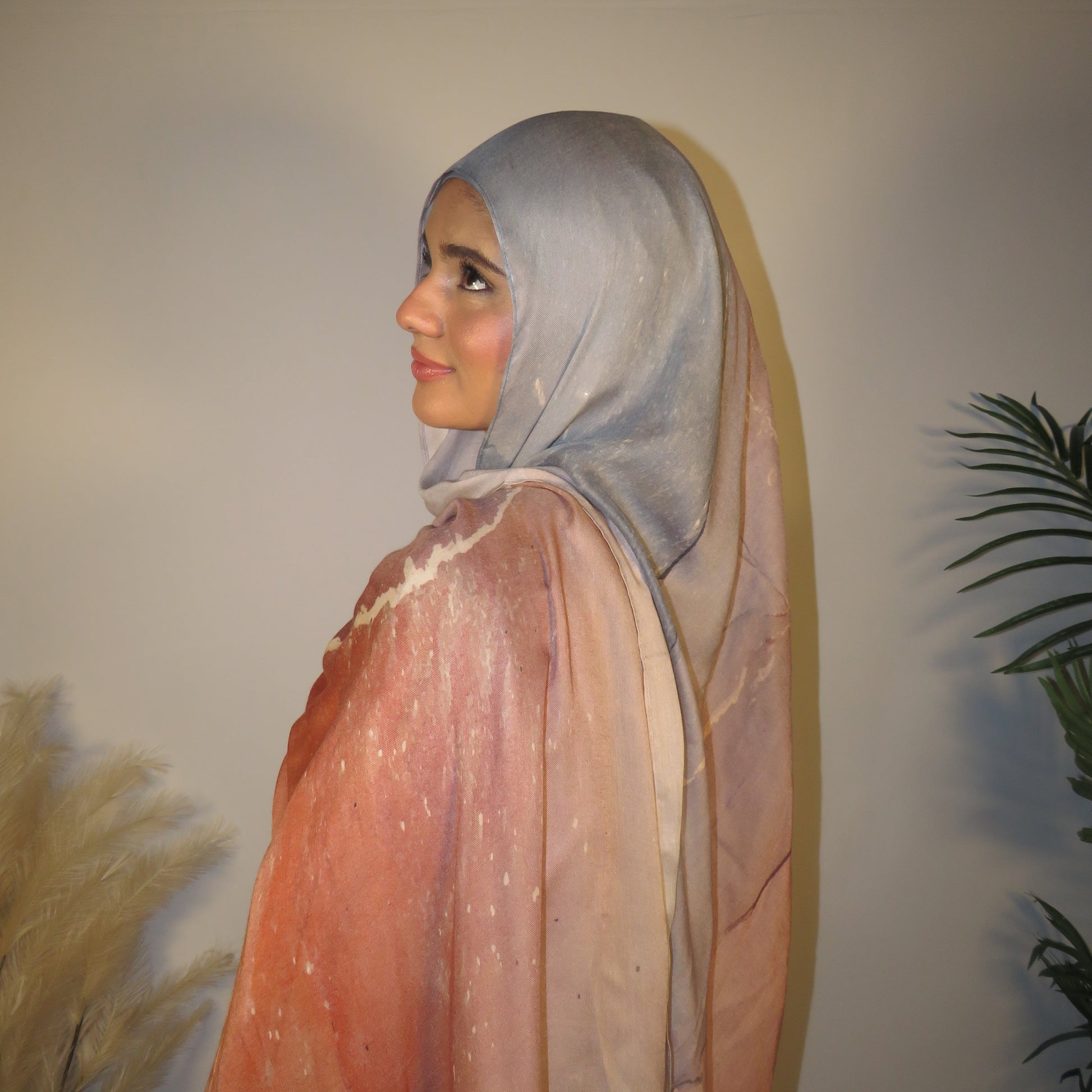 Chromatic Blend is a graceful fusion of warm peaches, rich oranges, and cool blue-greys, melting into one another in a soft ombré that feels like dusk meeting dawn. Hints of white and delicate gold embellishments shimmer across the fabric. It’s bold, yet effortlessly refined.