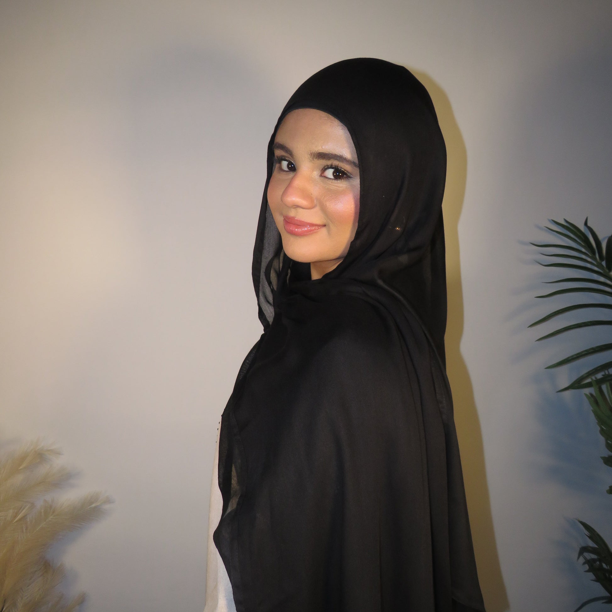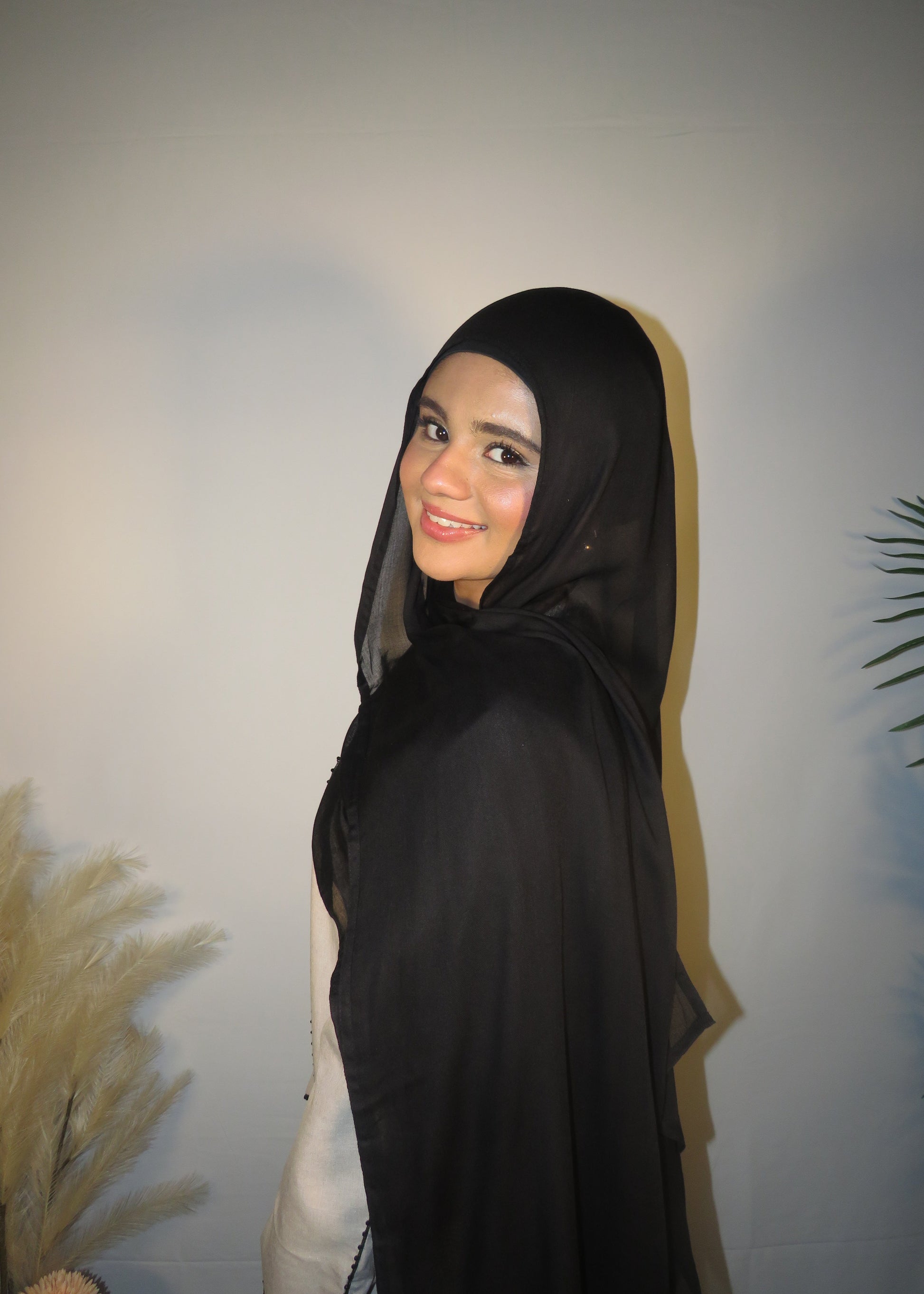 Midnight Muse; a deep, inky black that drapes like poetry, the piece that belongs in every wardrobe. Chic in its simplicity and powerful in its presence, it elevates any look, day or night. Whether it’s your daily go-to or your evening statement, this hijab is the definition of classic.